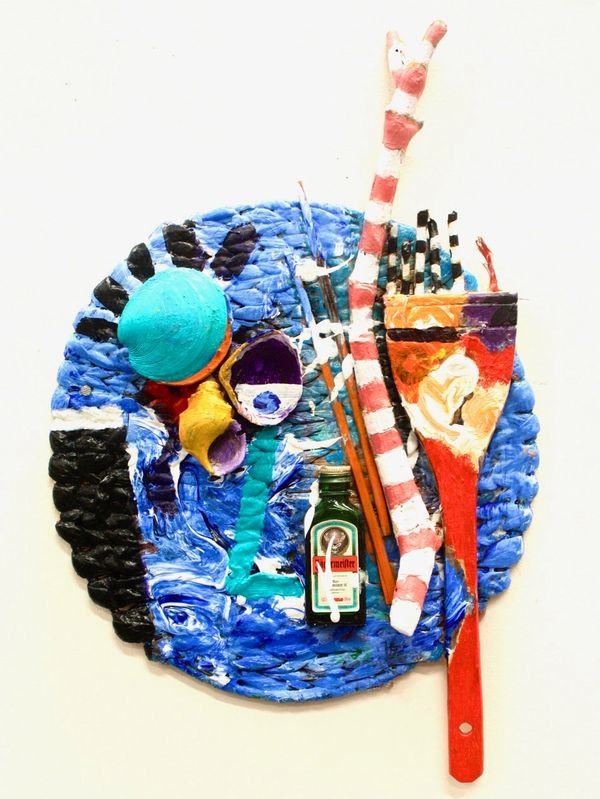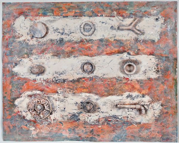 "Pod Painting with Nine Found Objects" acrylic, oil and found objects on paper 81x101cm.