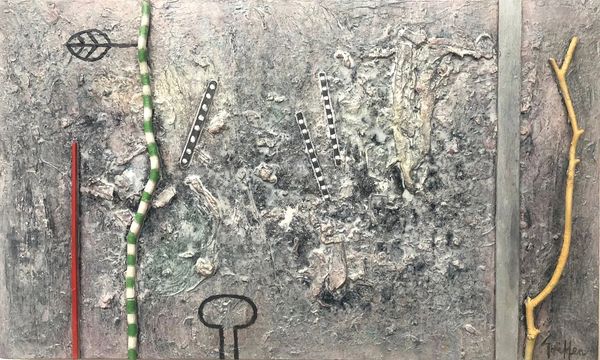 The Seven Mile Diggings acrylic and found objects on board 25x30cm