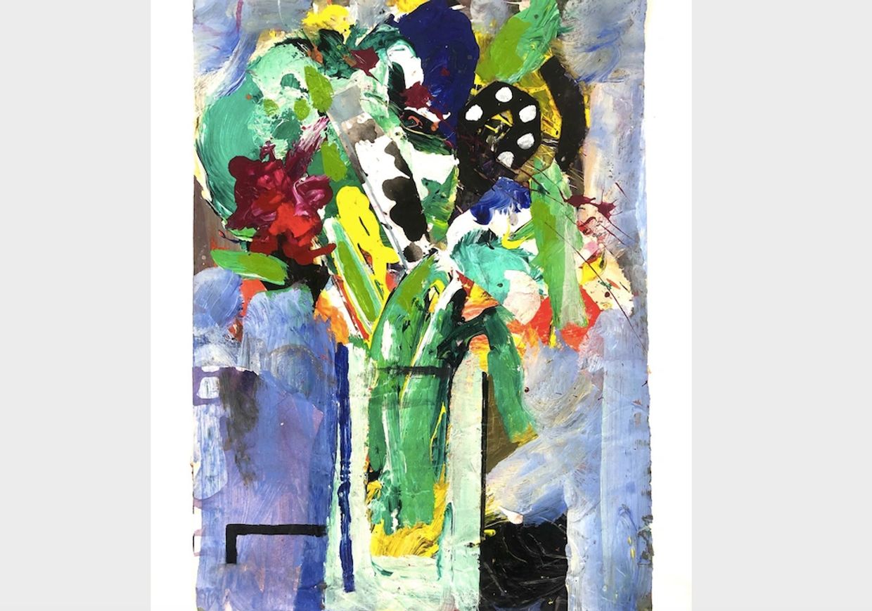 Coloured Flowers in a Blue Vase acrylic on paper 58x 42cm.